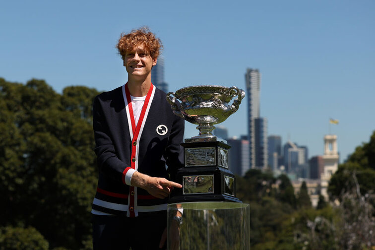Bei den Siegerfotos im "Royal Botanic Garden" von Melbourne beließ es Sinner (und damit auch Sponsor) bei einem chicken Cardigan, den der frisch gebackenen Australian-Open-Champion von seinem Sponsor. Ansonsten war auch nicht sein Outfit sondern der Pokal der Hauptdarsteller der Bilder. Auf Instagram kommentierte Sinner die Bilder mit den "Daraus sind Träume gemacht".